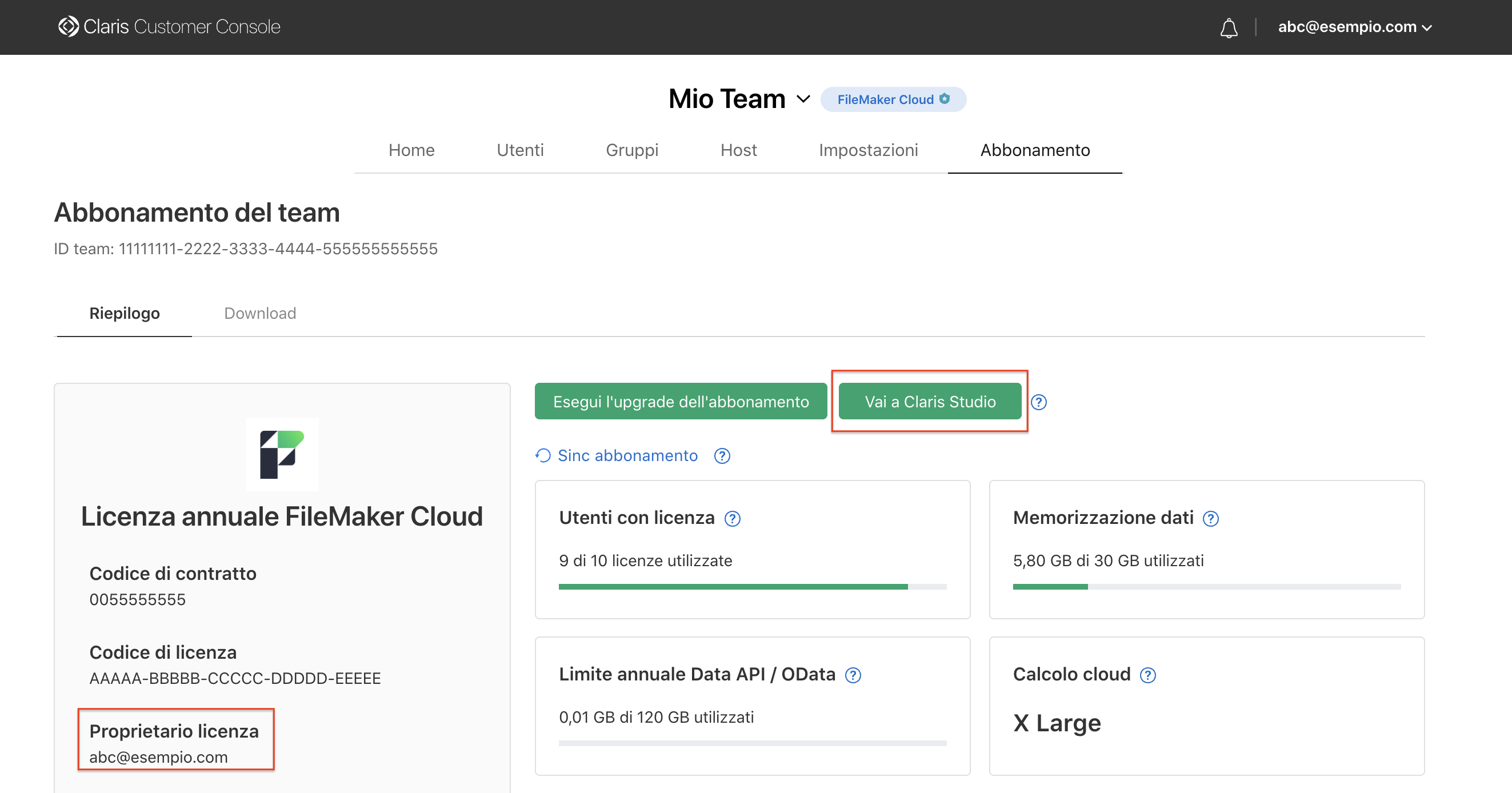 Nella Claris Customer Console, fare clic sulla scheda Abbonamento.