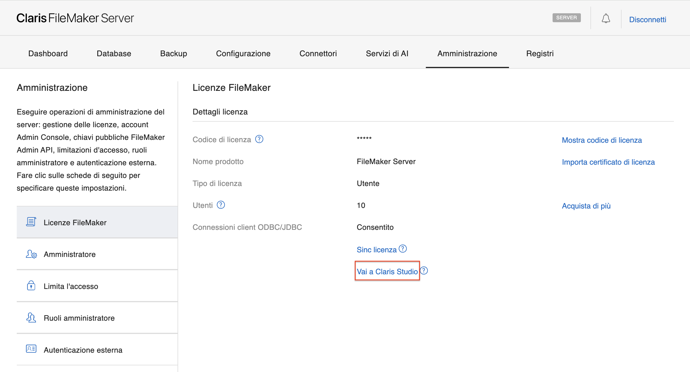 Fare clic su Vai a Claris Studio. Questo collegamento è disponibile solo per il proprietario della licenza.