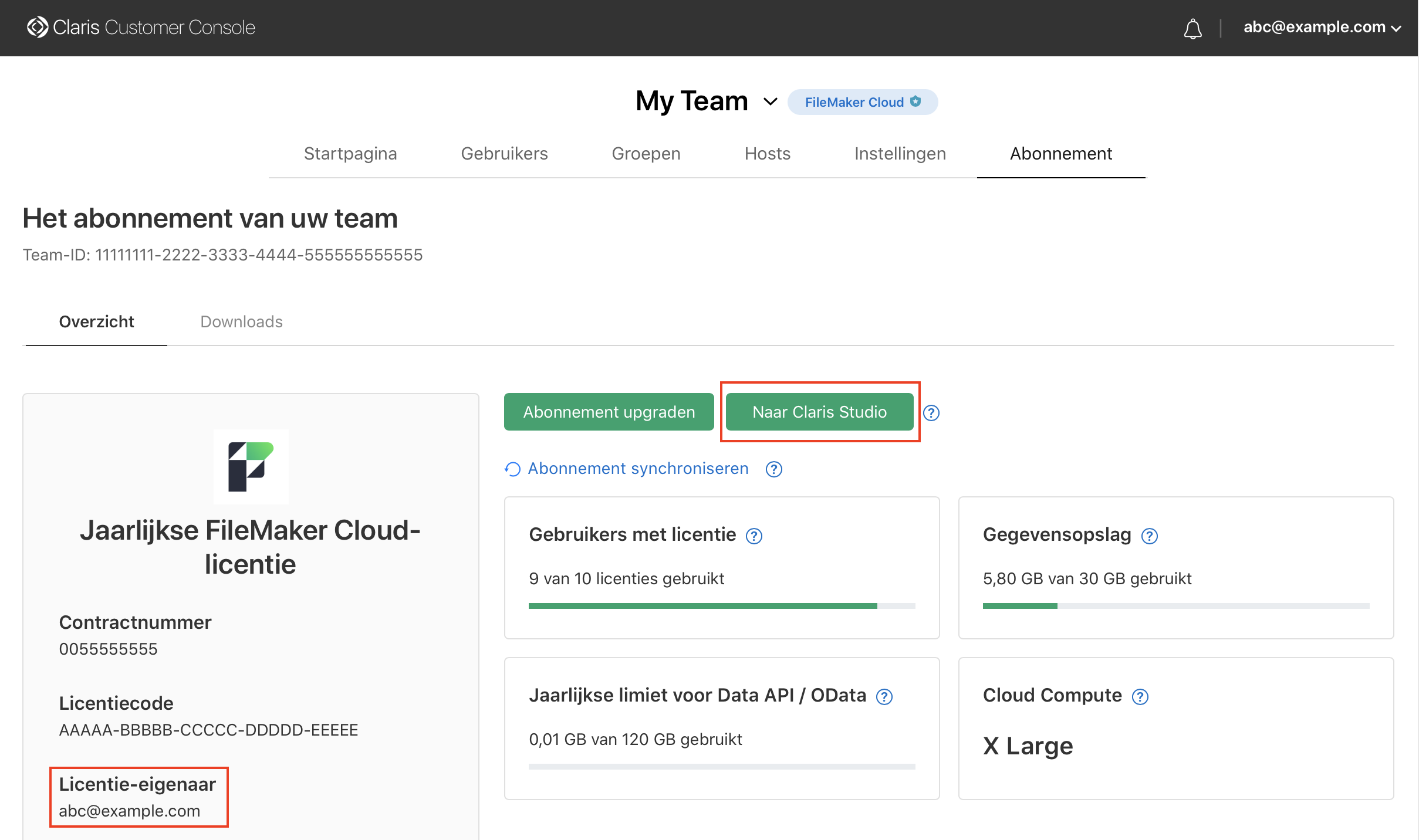 De locatie van de koppeling Naar Claris Studio en het e-mailadres van de licentie-eigenaar op de abonnementenpagina in Claris Customer Console